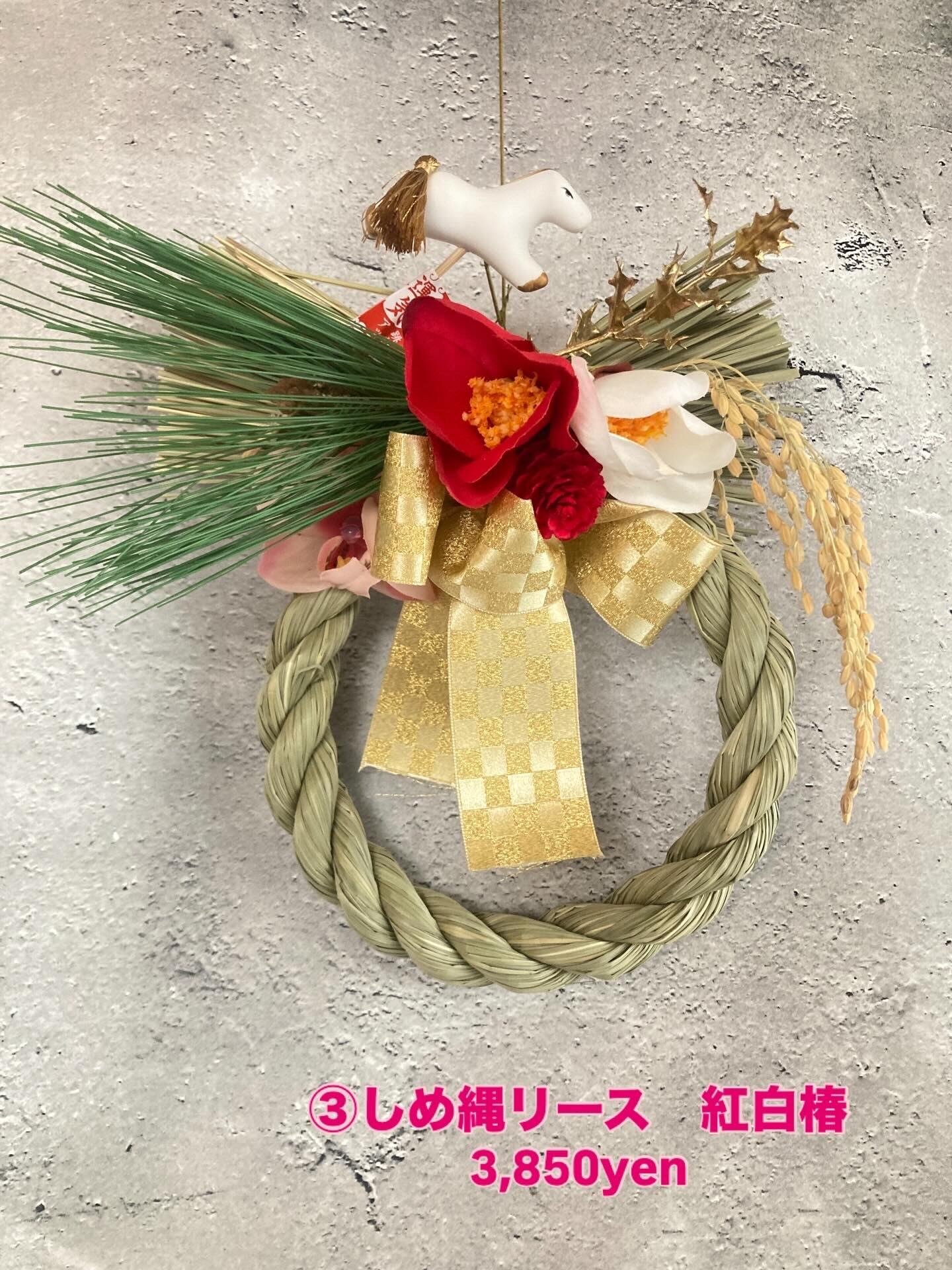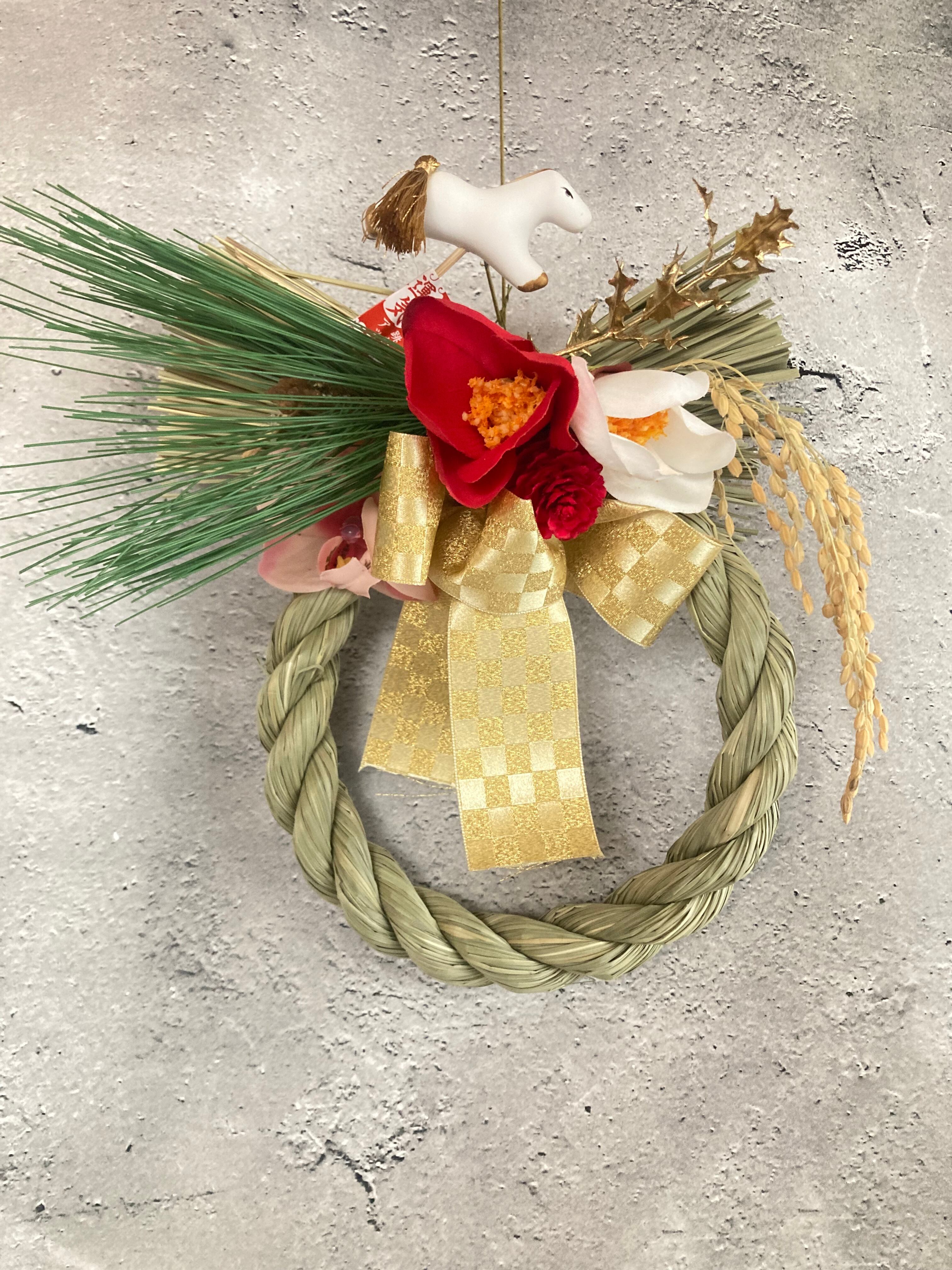 お正月らしい紅白の椿と今年の干支 天馬をつかい、可愛らしさと豪華さのあるリースとなっております。 全体の大きさ25cmくらい 商品は造花でできています